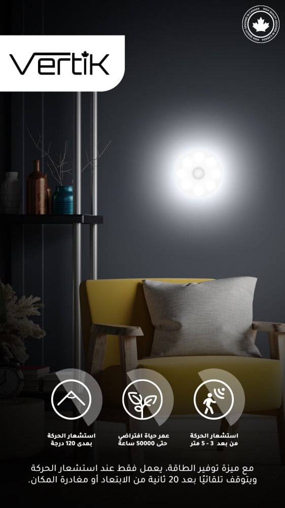 إضاءة بمستشعر ذكي للحركة يعمل بشكل تلقائي.