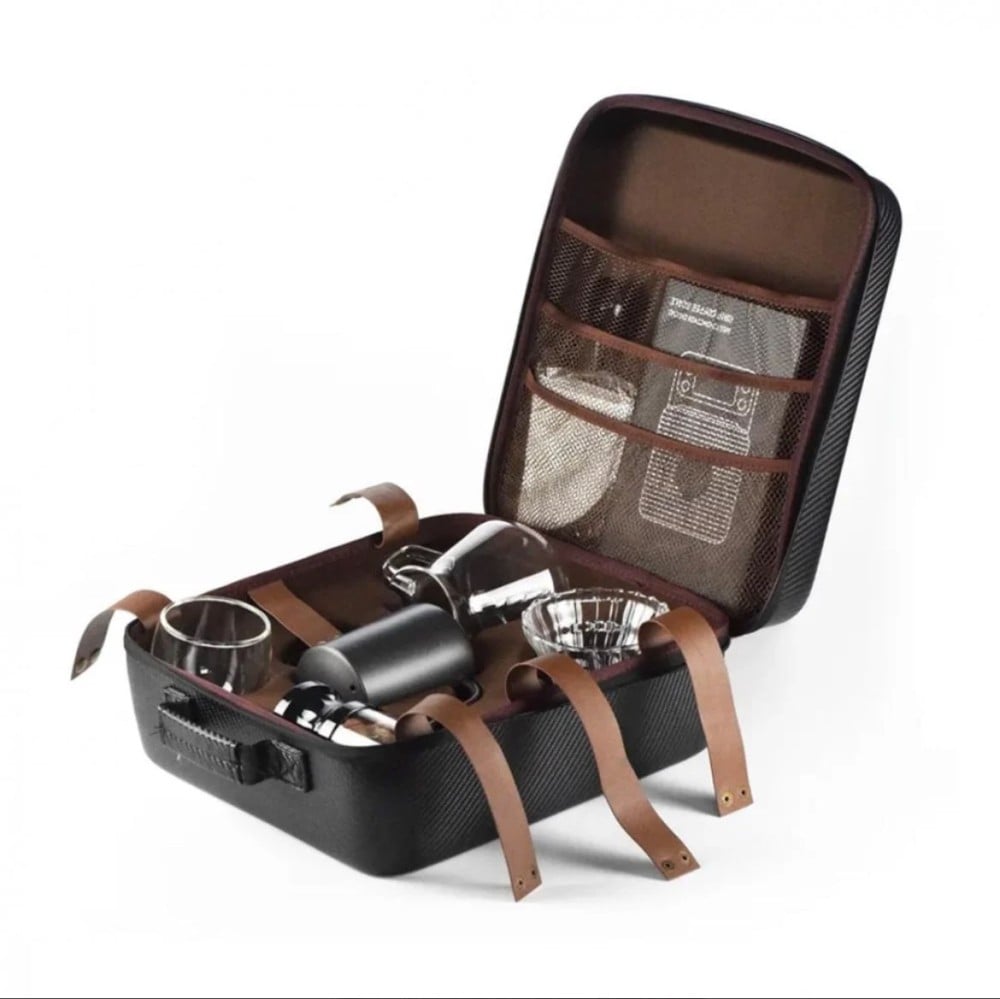 تحتوي الحقيبة على الأدوات الأساسية التي تحتاجها لتحضير قهوة لذيذة ومتميزة، بما في ذلك إبريق الترشيح، ووعاء القمع V60، وميزان ، و طاحونة القهوة،