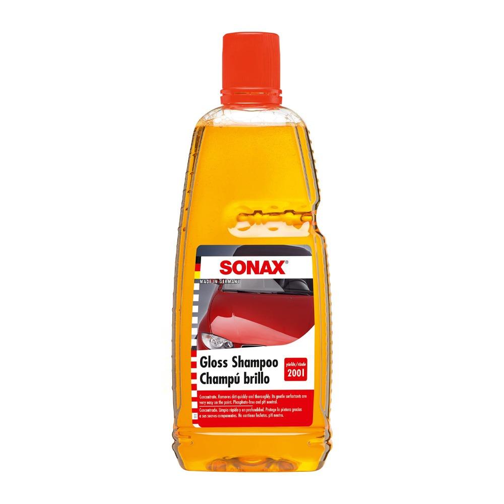 منتج Sonax Gloss Shampoo، وهو شامبو خاص بغسيل السيارات. يتميز بسائل أصفر اللون مع غطاء أحمر. يستخدم هذا المنتج لتنظيف هيكل السيارة بفعالية، مع تعزيز لمعان الطلاء.